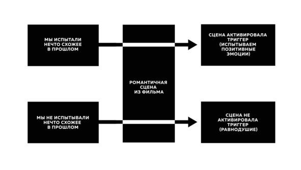 В кадре герой А и героиня Б сливаются в страстном поцелуе, преодолев неловкость первого знакомства. Оба молоды и неопытны. Каждый из нас так или иначе, рано или поздно проходит через нечто подобное. Кто-то раньше, а кто-то позже, но чувство влюблённости, заставляющее нас нервничать, вести себя странно и необдуманно, так или иначе станет частью нашего опыта. Когда мы наблюдаем в кадре героев и видим их неловкость, мы волей-неволей активируем внутри себя триггер, который заставляет мозг подсовывать нам нужные воспоминания. Эти воспоминания помогают поставить себя на место персонажей и лучше прочувствовать сцену. «Ох, да — я ведь тоже когда-то был на его месте», — думаем мы, испытывая неловкость и умиление. Назовем эту реакцию ТРИГГЕРОМ — ПОЗИТИВНЫМ ОПЫТОМ (ТПО).