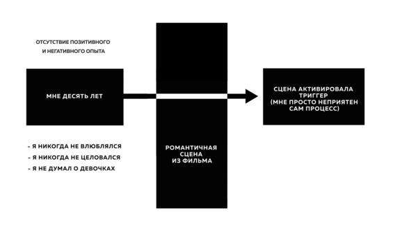Давайте вернемся к ТН — неопытности. Даже если десятилетний мальчик, увидевший на экране сцену поцелуя, съежится в отвращении, это будет лишь мимолетная детская реакция, которая тотчас забудется. Все потому, что это событие не находит отклика в прошлом, как позитивного, так и негативного. Юный зритель лишь мимолетно среагирует на непонятное для него явление, однако в силу того, что сопоставить это явление с собственным опытом не представляется возможным, реакция хоть и будет негативной, но в то же время абсолютно пустой:
