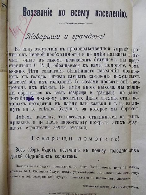 Воззвание к населению Вязников о помощи голодающим. 1918. Государственный архив Владимирской области