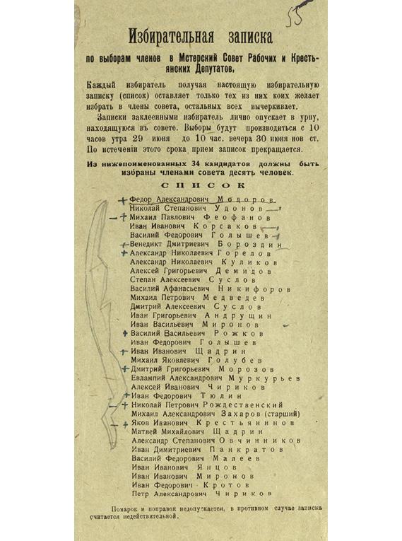 Избирательная записка по выборам членов Мстёрского совдепа. Июнь 1918. Государственный архив Владимирской области