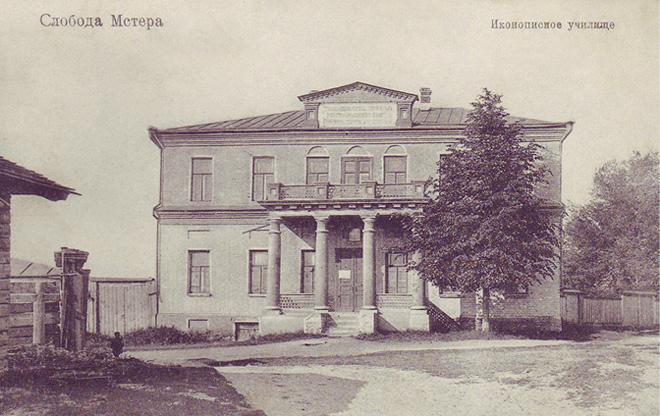 Она открылась в 1889 году, и первым преподавателем в ней был мстёрский иконописец М. И. Цепков, учившийся в Московском училище живописи, ваяния и зодчества (МУЖВЗ)2. Временем наиболее эффективной и плодотворной работы школы-мастерской следует считать период с 1902 года, когда она перешла под патронаж Комитета попечительства о русской иконописи. Газета «Владимирские губернские ведомости» так описывала ее учебный процесс: «Постановка преподавания здесь существенно отличается от преподавания в обычных школах рисования. Прежде всего, школе придан вид мастерской, где занятия ведутся целый день, причем часы занятий иконописью и рисованием сменяются чтением по Закону Божию, по иконографии, церковной археологии. Во главе обучения поставлено рисование… Художники, получившие высшее… образование в Академии художеств… следя за общим ходом занятий в мастерских, сами преподают ученикам рисование, костную и мышечную анатомию и учение о перспективе. Преподавание это ведется по методам, найденным наиболее целесообразными в обычных художественных школах. Наряду с этим в каждой учебной мастерской по два учителя из лучших и искуснейших местных мастеров-иконописцев преподают ученикам все секреты иконописного мастерства, знакомя учеников со всеми древнерусскими пошибами иконных писем»3. Курс, преподававшийся М. И. Цепковым и С. А. Сусловым, а позднее И. В. Брягиным, заканчивался сообщением сведений о фресковой стенописи и способах реставрации древних икон.