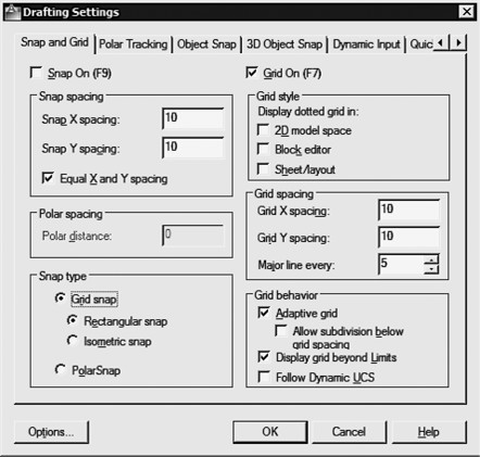 • настройки режимов шага привязки SNAP, сетки GRID и ортогонального режима ORTHO;