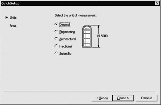 • диалоговое окно быстрой подготовки Quick Setup позволяет выполнить быструю установку параметров рабочей среды AutoCAD: выбрать единицы измерения длины Units и определить границы области черчения Area.