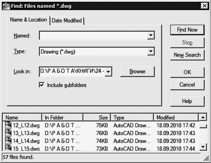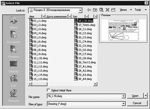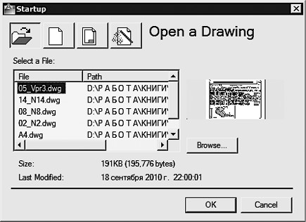 Open a Drawing — открытие ранее созданного чертежа. Позволяет выбрать из списка один из рисунков, открывавшихся последними, и загрузить его в AutoCAD. Чтобы загрузить файл, отсутствующий в списке, следует нажать кнопку обзора Browse....