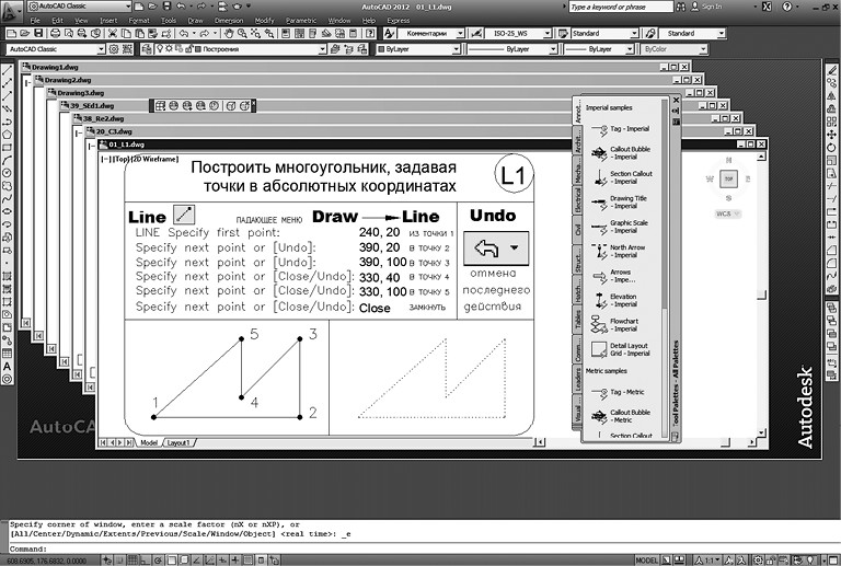 • Tool Palettes Window (Ctrl+3) — инструментальные палитры в виде отдельных вкладок специального окна, которые служат эффективным средством хранения/вставки блоков и штриховки. Палитры могут содержать инструменты, предоставленные сторонними разработчиками;