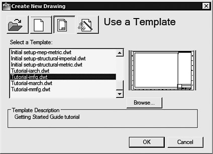 Use a Template — создание чертежа по шаблону — документу, установки которого используются как основа для нового рисунка. В области Select a Template: выбирается шаблон, содержащий необходимые установки черчения. В списке перечисляются имена файлов шаблонов с расширением DWT, которые найдены по стандартному пути, заданному в диалоговом окне настроек Options. В шаблонах определяются различные параметры рисунка, в том числе наборы специально созданных слоев, типов линий и видов.