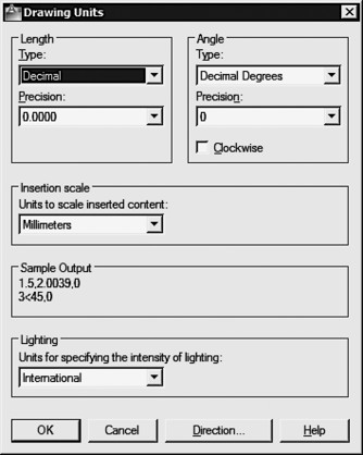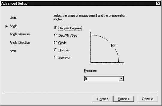 • диалоговое окно детальной подготовки Advanced Setup позволяет выполнить полную установку параметров рабочей среды AutoCAD: назначить единицы измерения длины Units и угла Angle, задать начало отсчета угла Angle Measure и направление его измерения Angle Direction, определить границы области рисунка Area;