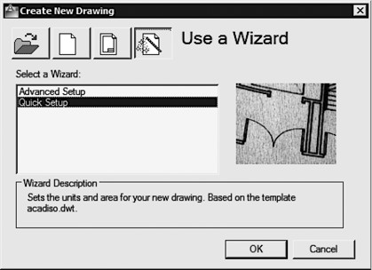 Use a Wizard — вызов Мастера для установки параметров нового чертежа. В области Select a Wizard: предлагается два режима автоматической настройки рабочей среды AutoCAD — детальная подготовка Advanced Setup и быстрая подготовка Quick Setup: