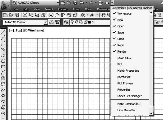Работая в одном из рабочих пространств, удобно отобразить строку падающих меню. Для этого необходимо на панели быстрого доступа (см. рис. 2.3) щелкнуть кнопкой мыши на стрелке в правой части панели и из раскрывающегося списка команд выбрать Show Menu Bar.