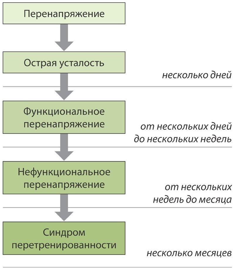 В краткосрочной перспективе переутомление мышц на протяжении нескольких тренировок подряд может способствовать началу адаптаций, однако слишком много дней с переутомлением подряд при недостаточном отдыхе и восстановлении может привести к нефункциональному перенапряжению, что легко может перерасти в синдром перетренированности. На рисунке 1 показано, как физическое напряжение может накапливаться и привести к синдрому перетренированности.