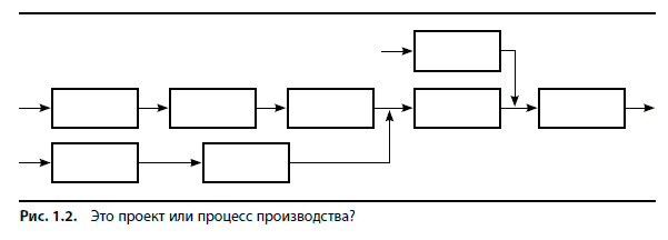 Иногда, чтобы отличить проекты от обычного производства, смотрят на количество получаемой продукции и на относительную длительность операций. При реализации проектов обычно возникает результат в своем роде уникальный. В ходе производства же появляется значительное количество более-менее похожих единиц продукции. Некоторое пересечение есть между проектом и изготовлением под конкретные пожелания заказчика (например, сборка автомобиля на заказ). Как я обнаружил, многие считают, что стандартное производство и проекты — совершенно разные вещи. В середине 1990-х я первый раз услышал о теории ограничений систем — ТОС, впервые описанной доктором Элияху Голдраттом в книге «Цель» (The Goal) [2]. Порекомендовав роман нескольким менеджерам проектов и программ, выяснил, что никто не видел никакой связи между ТОС и управлением проектами. Впоследствии я нашел способ преодолеть власть традиционной парадигмы мышления. Показывая людям рис. 1.2, я спрашиваю: «Что это — проект или процесс производства?» Реакция аудитории очень интересная. В большинстве случаев вид у всех озадаченный. Быстрого ответа не дает никто. Затем один предполагает: «Может быть, и то, и то». Остальные сразу соглашаются. На самом деле может быть и так, и так. На этом уровне сходства очевиднее различий. Поэтому в первую очередь мы с вами проанализируем такую общую черту проектов и производства, как вариабельность длительности отдельных операций. Речь идет об операциях, преобразующих некие входные параметры в результаты на выходе; из таких операций состоят как взаимозависимые этапы производственного процесса, так и этапы реализации любого проекта.