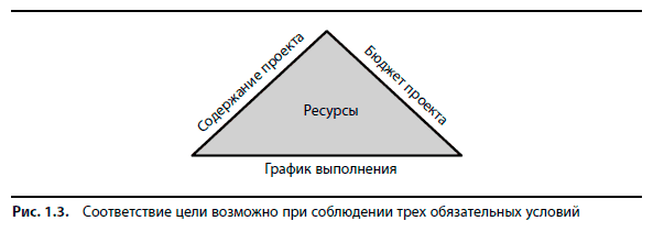 Успешным является проект, который соответствует требованиям всех лиц, участвующих в его реализации. У каждого проекта есть цель. Цель достигается при соблюдении трех граничных условий, как показано на рис. 1.3. Содержание проекта — проектное задание — это описание того, чего как минимум мы хотим достичь по завершении проекта, каков желаемый результат. Бюджет проекта и график выполнения — максимум того, что мы готовы на это потратить. В центре — ресурсы, они связаны с каждым из трех необходимых условий и влияют на них и на успешность реализации проекта.