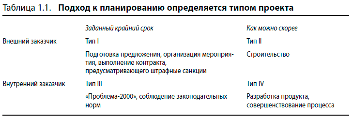 В табл. 1.1 показаны четыре типа проектов. По горизонтали дана классификация по характеру временных условий: «заданный крайний срок» или «как можно скорее». По вертикали проекты делятся на внутренние (как правило, нацеленные на улучшение оперативных процессов) и внешние (исполняемые для получения прибыли). Ответы на перечисленные ранее вопросы будут зависеть от типа проекта. В таблице также приведены некоторые примеры.