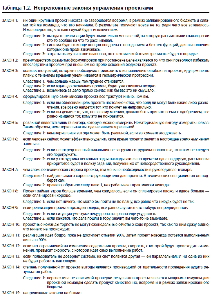 Мысли, изложенные в табл. 1.2, зародились в среде руководителей проектов и теперь благодаря Интернету гуляют по всему миру. Это лишь один пример из массы подобных, свидетельствующих лишний раз о том, сколь часто проекты завершаются неудачей. Полезно отметить, что для этих неудач не существует культурных и национальных границ. Во многих книгах по управлению проектами есть разделы о причинах провалов и способах их устранения.