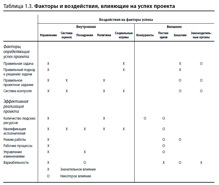 Один из путей к пониманию причин успехов и провалов проектов — изучение организационной системы и тех исходных установок, на которых она базируется. По словам Альдо Леопольда [11], который в своей профессиональной деятельности занимался вопросами, не связанными с проектами, мы, несомненно, могли бы выявить факторы, которые влияют на успешность реализации проектов. Факторы — это то, что более-менее прямо сказывается на успехе, то есть на степени соответствия трем необходимым условиям успеха проекта. Итак, факторы успеха — это: