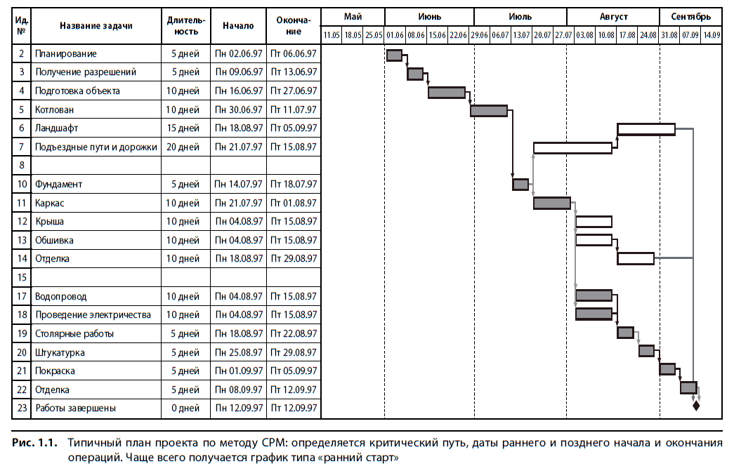 Большинство программных продуктов и абсолютно все приложения, которые мне встречались, в рамках СРМ настроены на создание графика типа «ранний старт». Это означает, что программа составит расписание работ таким образом, чтобы они начинались как можно раньше и помещались на графике как можно левее. На рис. 1.1 дан типичный план проекта, построенный таким образом.