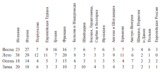 4. Времена года. Собрав данные о политических преступлениях в Европе в течение 100 лет, мы находим, что по временам года они распределяются следующим образом: