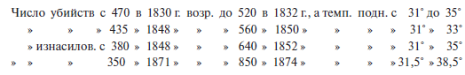 Влияние температуры в период с 1825 по 1848 год нам кажется даже более резко выраженным и постоянным, чем влияние земледельческой производительности. С1848 года, если не считать несколько тяжелых земледельческих и политических кризисов, замечается время от времени совпадение между колебанием температуры и преступлениями, особенно в отношении предумышленных и случайных убийств, как это наблюдалось в следующие годы: 1826, 1829, 1831–1832, 1833, 1842–1843, 1844–1845, 1846, 1858, 1865 и 1867–1868. Подобное же совпадение, но в более резкой и очевидной степени имеет место в отношении изнасилований и преступлений против чести, которые более точно следуют за годовыми температурными колебаниями. Так,