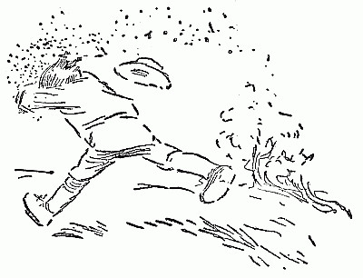 So off they started, a good half hour's tramp in the sun. The blackberry patch was in a far unused corner of the graveyard, adjoining a plot of unconsecrated ground where, as Willie and Margery had often heard, only murderers were buried. There was, of course, the usual No Trespassing sign to meet and pass, the wire fence to slip under, and a short stretch of clay and rubble which ended suddenly in a thick brake of blackberry bushes. Once in the patch all that was necessary was to keep a sharp eye on the gravedigger's house, which stood on a knoll beyond, in plain sight, but far enough away to give one a good chance of escape in case of detection.