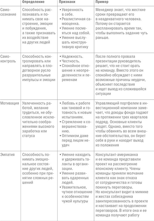 Весь прошлый год мы вместе с коллегами на примере различных организаций тщательно изучали механизмы, лежащие в основе эмоционального интеллекта. Мы анализировали связь эмоционального интеллекта с высокой эффективностью деятельности, особенно на высших уровнях управления; наблюдали, как эмоциональный интеллект проявляется в сфере трудовых отношений. Например: как определить, обладает ли кто-то развитым эмоциональным интеллектом? Как распознать это качество в самом себе? Ниже мы даем ответы на эти и другие вопросы, поочередно рассматривая каждую составляющую эмоционального интеллекта: самосознание, самоконтроль, мотивацию, способность к сопереживанию и социальные навыки.