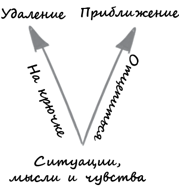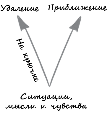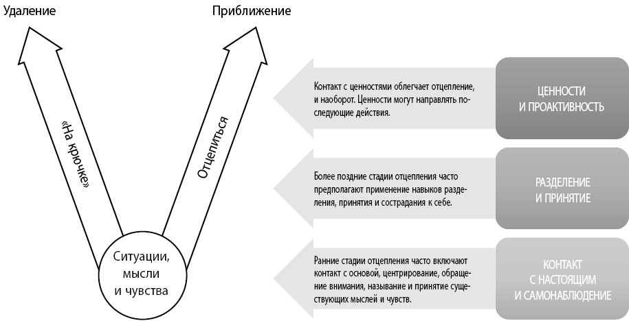 Обычно терапевт подготавливает клиента к открытию этой принципиально новой точки зрения с помощью конструктивного использования слов «подцепить на крючок»: «И вот, когда вы «на крючке» у этих мыслей и чувств, вы делаете одно или другое». Такая речь закладывает хорошую основу для дальнейшей работы: во время последующих сессий клиенту предстоит испытать, каково ощущать сложные мысли и чувства, но реагировать на них осознанно, не пытаясь избежать их или избавиться от них, тем самым снижая их воздействие.