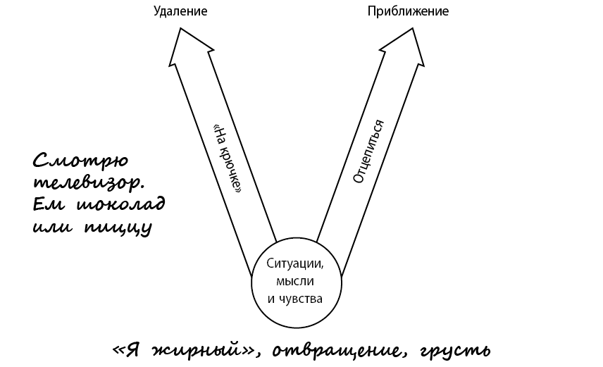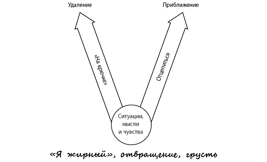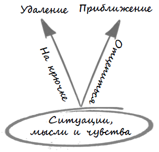 Терапевт: То есть, когда вас цепляют «на крючок» такие мысли и чувства (указывает на низ диаграммы), вы обычно делаете что-то подобное (указывает на отдаляющие действия)?