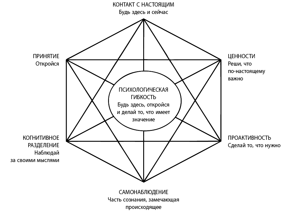 Шесть основных терапевтических процессов АСТ – это контакт с настоящим, когнитивное разделение, принятие, самонаблюдение, ценности и проактивность. Прежде чем мы рассмотрим их по порядку, посмотрите на схему (см. с. 20), которую легкомысленно окрестили гексафлексом АСТ.