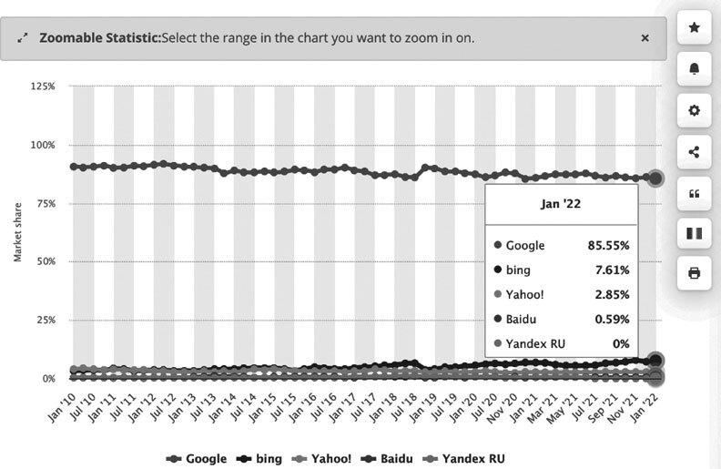 На момент написания книги в стране были представлены несколько основных поисковых систем. Согласно данным «Яндекс. Радар»[3], они занимали следующие доли: