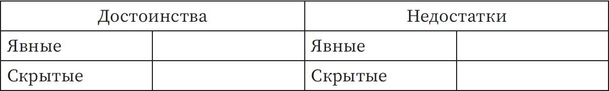 Можно нарисовать таблицу со своими критериями или для дегустации этого метода воспользоваться готовым шаблоном ниже, добавляя при необходимости свои пункты.