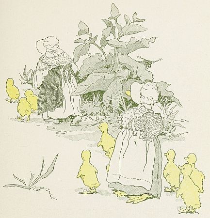 The other four ducklings were afraid they oughtn’t to go, but Squdge and Queek were so eager to, and so unwilling to turn back, that after a while the others, too, agreed to go on to the[85] [86] [87] farmyard. The ragged chicken led the way, and they all followed.