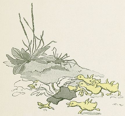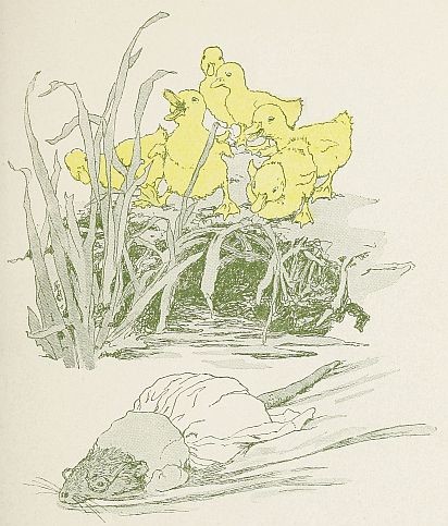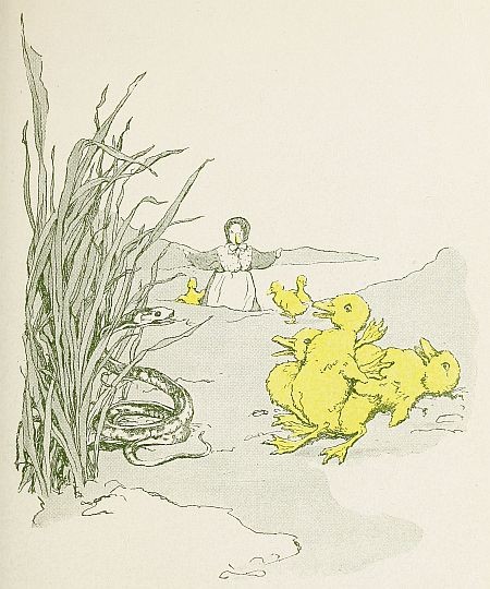 It was not very long, however, before their mother called to them that they could come, and the little ducklings ran joyously down the slope and slipped off into the water. There they paddled up and down, and stood on their heads, and ran water races with each other as merrily as ever, their adventure with the snake quite forgotten.