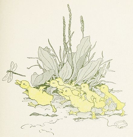 On and on they went, leaping and snatching, and sometimes falling over each other in their hurry. At last their chase led them out into a road, and then the fly rose straight up over their heads, up and up until it was lost to sight in the sunlit air. The ducklings stood gaping after it hungrily.