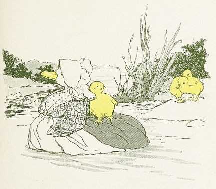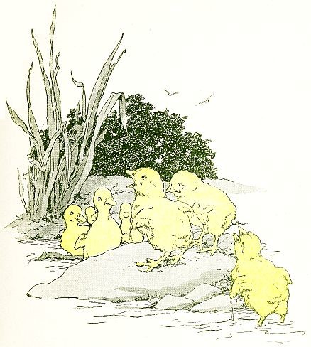 The duck and the hen had reached the river side, and the hen had seen her chickens far out on a rock, wet and shivering with fear. “Oh what shall I do! What shall I do,” she shrieked. “They can never get back.”