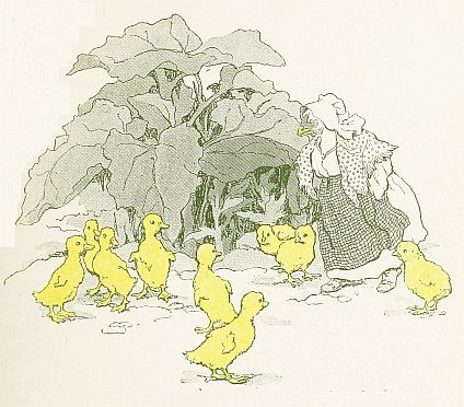 But the worst thing of all at the farmhouse was the way the farmer’s wife used to steal the duck’s eggs. No matter how carefully Mrs. Duck hid her eggs, Mrs. Farmer always found them and took them away. Once she put a number of them in a hen’s nest, and allowed a hen to set on them. After a while the hen hatched out eleven of the cunningest, fuzziest, yellowest ducklings that ever were seen. The hen was just as pleased and proud as though she had laid the eggs herself. But she didn’t in the least know how to bring up a brood of ducklings. Mrs. Duck could see that very plainly. She didn’t even want them to get their feet wet and she almost had a fit when they went into the water one day.