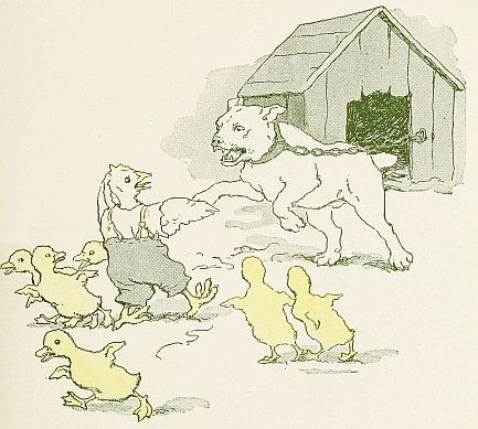 On and on ran the chicken, and on and on ran the ducklings. For all they knew the dog might have broken his chain and be close at their heels.