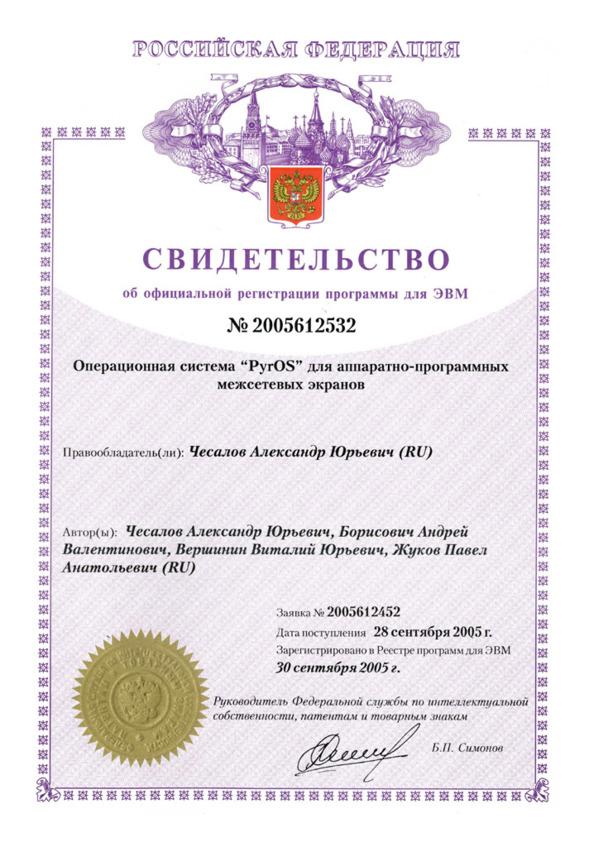 Свидетельство на ядро системы PyrOS было получено еще в 2005 году (№2005612532). Всего было получено 4 свидетельства на операционную систему PyrOS.