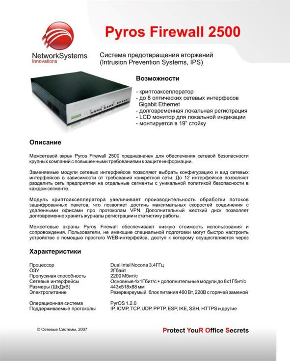 Первые прототипы файрволлов PyrOS Firewall 1500 собрали много положительных отзывов на международной выставке CeBIT 2007 в Германии. Там же были подписаны партнерские соглашения с ведущими разработчиками промышленных компьютеров Portwell, Arosser, Volktek и Sun Microsystems.