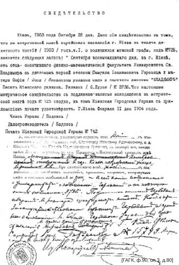 До этой находки биографы Горовица много лет спорили о времени и месте рождения великого музыканта, а справочные издания, включая «Музыкальную энциклопедию» безоговорочно указывали: «1904, г. Бердичев» [54, с.11].