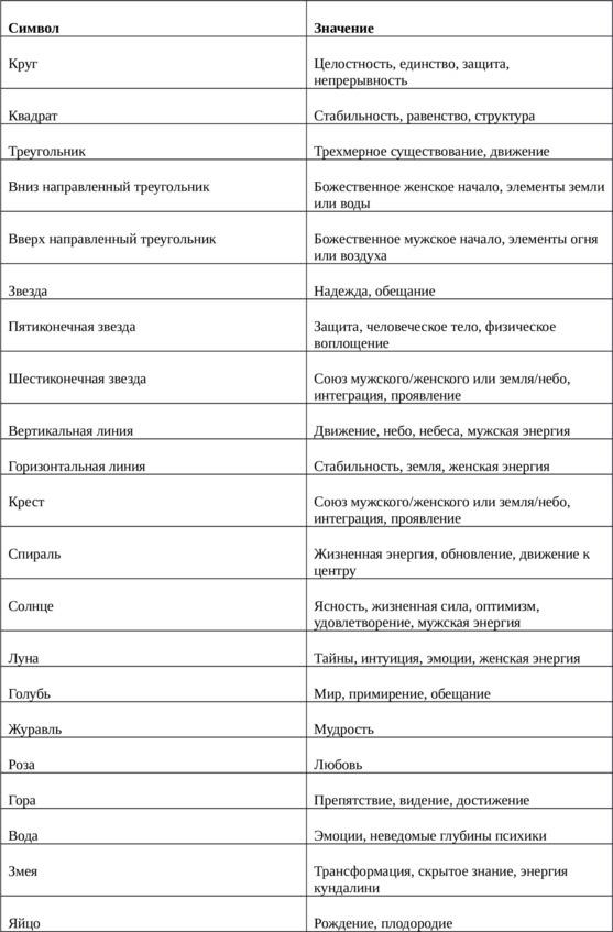 Художники Таро намеренно выбирают символы из различных духовных, культурных, магических и психологических традиций, чтобы передать информацию непосредственно Вашему подсознанию. Подобно мифам, символы преодолевают границы религии, национальности и времени, представляя универсальные темы и концепции, с которыми могут соотнестись люди повсюду. В следующей таблице представлены несколько общих, универсально понятных символов, которые часто встречаются на картах Таро, вместе с их обычными значениями.