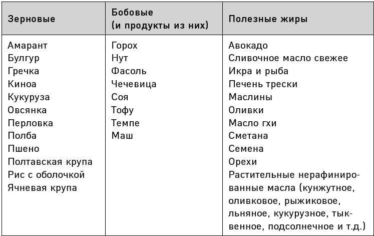 Также, чтобы подсказать вам, что можно есть при здоровом питании, ниже приведена таблица различных видов зерновых, бобовых, а также продуктов, в которых содержатся полезные жиры.
