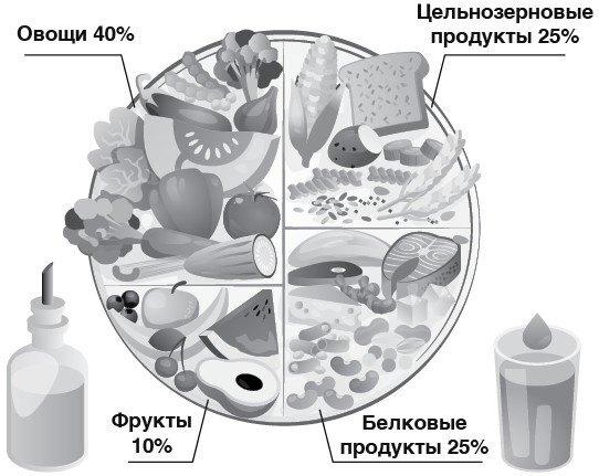 • ½ тарелки – клетчатка (овощи 3–4 порции в день, 1–2 порции фруктов/ягод);