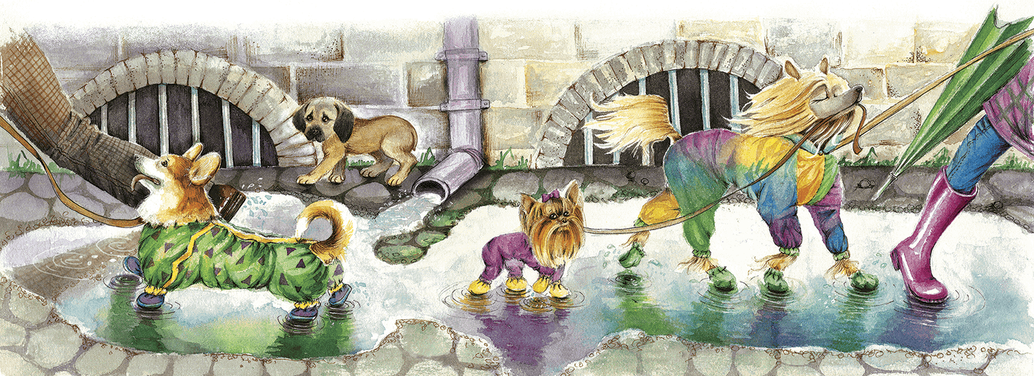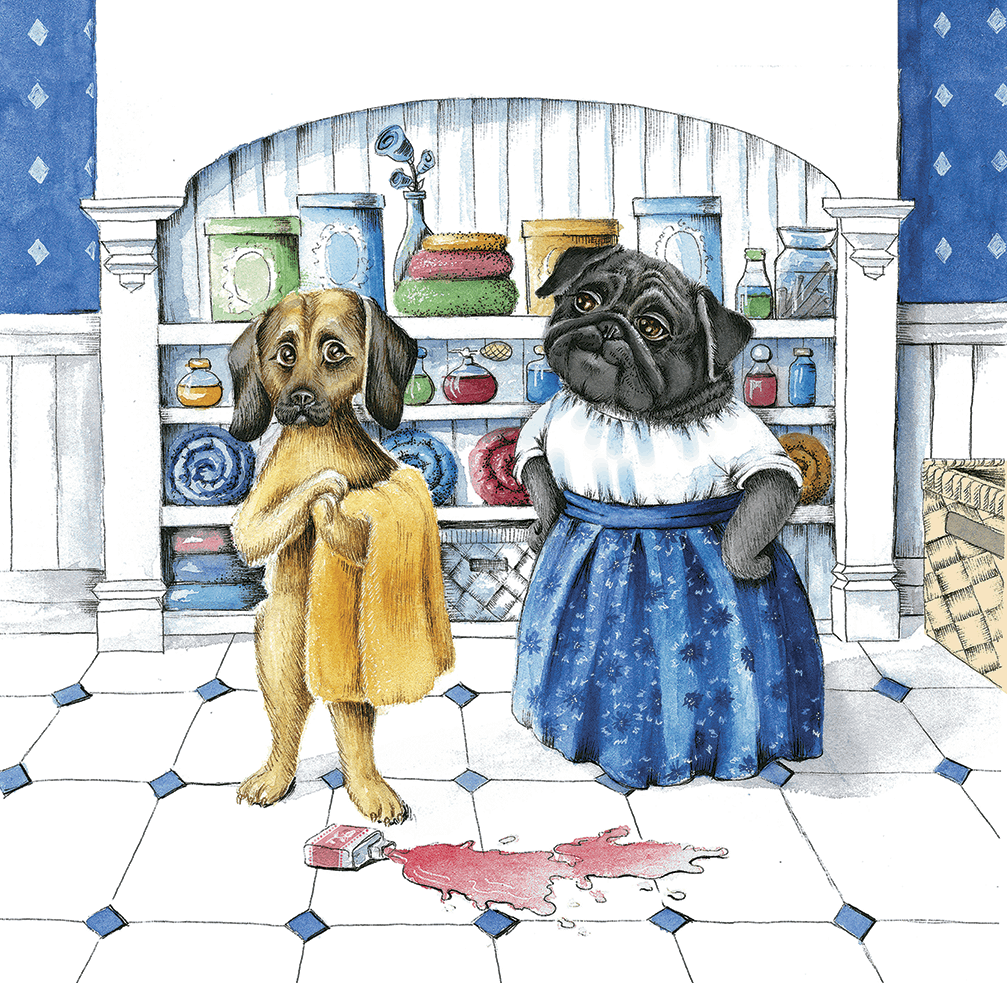Дверь домика распахнулась, из него вышла дородная собака в цветастом фартуке. Пошлавон сразу поняла, что перед ней мопс. В супермаркет, перед которым псинка выпрашивала подачки, часто приходил умный мопс Фанди со своим хозяином. Он всегда просил своего папу угостить Пошлавон чем-то вкусным, поэтому бездомная псинка считала мопсов очень добрыми. Мопсиха всплеснула лапами.