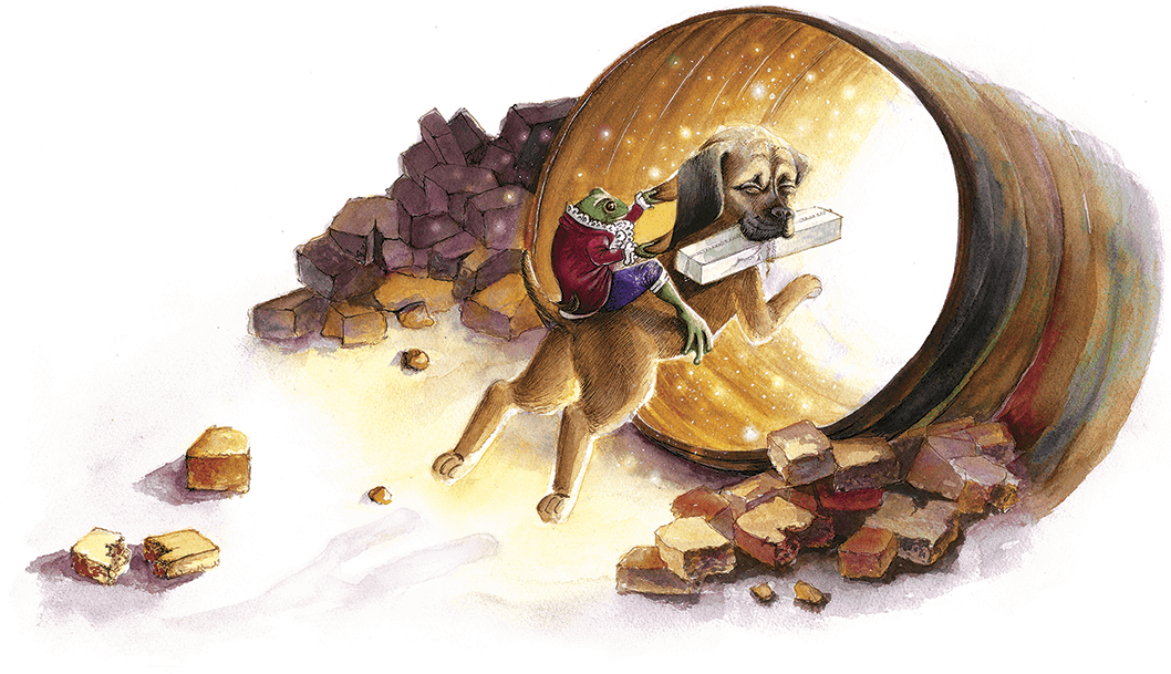 Густав издал резкий свист, бочка повернулась, наклонилась и легла на пол. Она оказалась пустой, ее дно вдруг стало таять, перед глазами щенка появилась точка света, она превратилась в кружок, затем в большое пятно, такое яркое, что Пошлавон зажмурилась.
