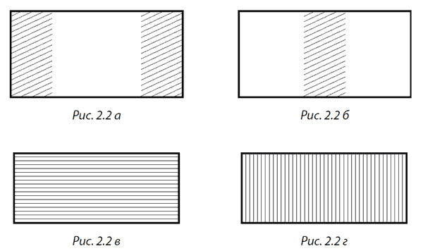 В первом случае фигура смотрится более естественно и предпочтительнее, нежели во втором. Данный пример подтверждает тот феноменальный факт, что зоны акцента находятся по краям прямоугольника, но уж никак не посредине. Вообще-то, прямоугольник чем-то напоминает биполярную фигуру, так как у него два расходящихся окончания. Но, с другой стороны, прямоугольник легко представить также и в виде однонаправленной фигуры, у которой есть начало (обычно это левый край) и окончание (правый край). Это свойство или состояние легко можно продемонстрировать примером (рис. 2.2 в): штриховка для зрителя направлена слева направо, а не наоборот. Как бы там ни было, но мы смотрим вдоль «продольности» прямоугольника, акцентируясь, как уже было сказано, по направлению. А вот чувство центра, некой общности у прямоугольника заметно ослаблено по сравнению с тем же квадратом, т. е. идея направления явно преобладает над идеей центричности (сравните рис. 2.2 а и 2.2 б). А теперь хотите небольшую визуально-психологическую «сшибку» по методу «кашу маслом испортишь»? Сравните, какая из двух фигур (рис. 2.2 г и 2.2 в) вам покажется целостней и собранней именно в образе прямоугольника. Скорее всего, та, что имеет вертикальную штриховку. Горизонтальный контур прямоугольника, противодействуя вертикальному направлению линий, создает напряжение, которое мы и воспринимаем как усиление фигуры. Совершенно иная ситуация с вариантом на рис. 2.2 г. Горизонтальные линии настолько усиливают эффект продольного движения, что вертикальные стороны прямоугольника уже не в силах удержать единство фигуры. Еще чуть-чуть, и мы сможем убедить себя, что видим просто связку горизонтальных линий. Фигура, как говорится, несколько «поплыла» по линии продольного акцента.