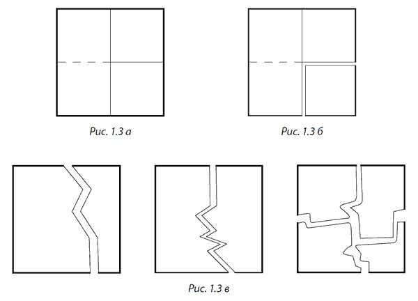 Если говорить в аспекте временном, то квадрат — фигура, задающая ход времени в прошлое, к изначальной матрице, к неким принципам, законам и правилам. Будущее для квадрата — то, что изначально было заложено в прошлом как программа или бизнес-план. А настоящее — то, что реализуется «здесь и сейчас» по изначально задуманному. Отсюда — нежелание квадратов адаптироваться к сиюминутному моменту и приспосабливаться к чему бы то ни было. Может, поэтому, глядя на раздробленный квадрат на каком-нибудь торговом флагштоке, мы тут же пытаемся перевести его, слить в первичную и узнаваемую фигуру (см. рис. 1.3 в). Но разъединенность нас все равно подспудно будет раздражать и тревожить. Ведь изначальный план почему-то был разрушен! Пророк Моисей скрижали с наставлениями Господа, которые собственноручно разбил из-за непослушания своего народа (Книга Исход, гл. 32, 19), позже, раскаявшись, тем не менее склеивать не стал. По воле Господа он воссоздаст их абсолютно заново, вытесав из камня (там же, гл. 34, 1). Но перед этим перебьет со своими приспешниками порядка трех тысяч упрямцев и смутьянов.