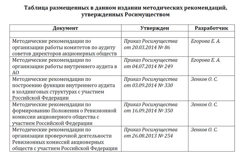 Одной из задач, с которой столкнулось Росимущество, было построение эффективно функционирующей системы акционерного контроля за деятельностью госкомпаний. В рамках методической поддержки данного процесса Росимуществом разработаны документы по организации деятельности ревизионных комиссий (Методические рекомендации по организации проверок, формированию Положения о ревизионной комиссии, Положения о вознаграждениях и компенсациях членов ревизионной комиссии).