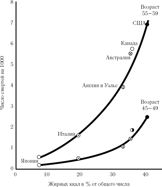 Исследование семи стран показало две важные вещи. Во-первых, уровень сердечно-сосудистых заболеваний в разных странах отличался. Это доказывает, что болезни могут определяться различными внешними условиями, например диетой, а не представляют собой неизбежный атрибут старения.