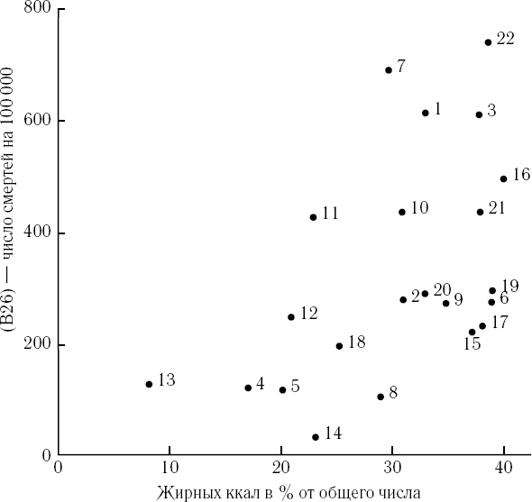 Правда, стран в его исследовании было всего шесть: США, Канада, Австралия, Англия и Уэльс, Япония, Италия, и другие ученые критиковали Киза за выборочный подход к статистике. В 1957 году Якоб Йерушалми и Херман Хильбо опубликовали более масштабное исследование, где выборку расширили до 22 стран, по которым была доступна качественная статистика ВОЗ и ФАО. Полученная картина [305] довольно сильно отличалась от той, что презентовал миру Киз: идеальная корреляция между потреблением жира и смертностью исчезла, зато появились страны, в которых уровень потребления жиров был примерно одинаковым, но смертность значительно варьировала (см. ). Например, США и Швеция, Дания, Норвегия, Финляндия и Франция, Мексика и Израиль. Критики Киза предположили, что на смертность и заболеваемость в большей степени влияют другие факторы, чем просто потребление жира.