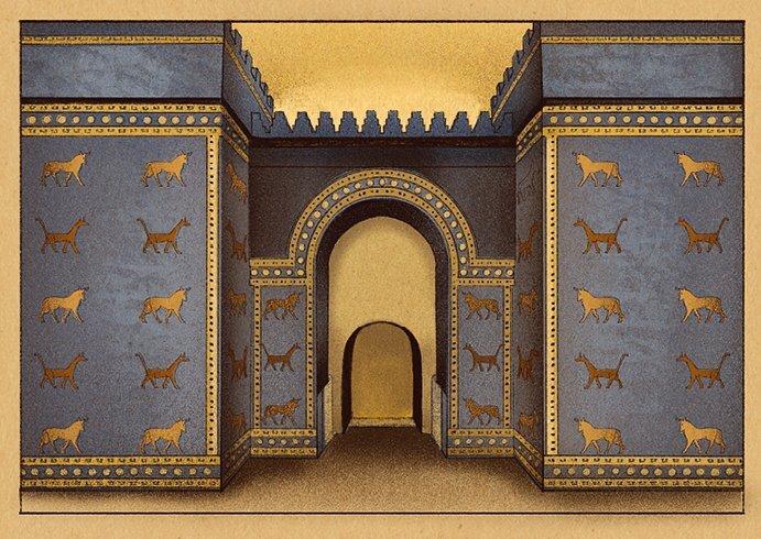 Основным строительным материалом служили кирпичи из глины. Кирпичи были двух видов: сырцовые, необожженные – просто высушенные на солнце (libittu), и обожженные в специальной печи (agurru). Первые широко использовались в строительстве, из них возводили бóльшую часть зданий, включая храмы. Однако такой кирпич в перспективе был менее прочным, и поэтому постройки из него нуждались в регулярной реставрации. Обожженный кирпич прочнее, однако его производство было более сложным и затратным, потому и сам он был менее распространен. Такой кирпич использовали для укрепления контактирующих с водой частей здания (например, набережные каналов, внешний периметр фундамента зиккурата Этеменанки в Вавилоне[14]) или же для декора фасадов. Во втором случае кирпичи agurru могли покрываться специальной цветной глазурью – голубой, белой, зеленой. Именно «лазуритовый» фасад ворот Иштар в Вавилоне стал «визитной карточкой» города. Подобным образом украшались многие другие дворцы и храмы.