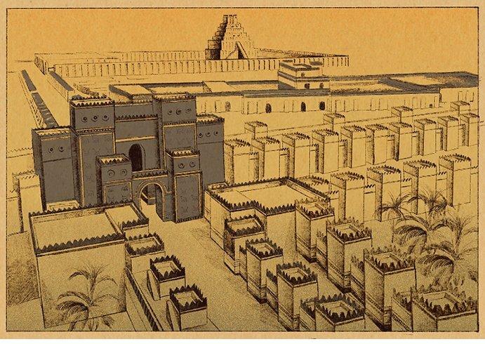 Вавилон (панорама). На переднем плане – дорога процессий и ворота Иштар, вдалеке возвышается зиккурат Этеменанки